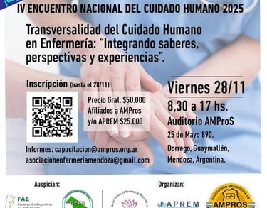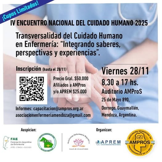APREM junto a AMPROS tiene el agrado de anunciar la realización del Cuarto Encuentro Nacional del Cuidado Humano 2025, un espacio destinado a la reflexión, el intercambio y la construcción colectiva de conocimientos en torno al cuidado humano en enfermería.